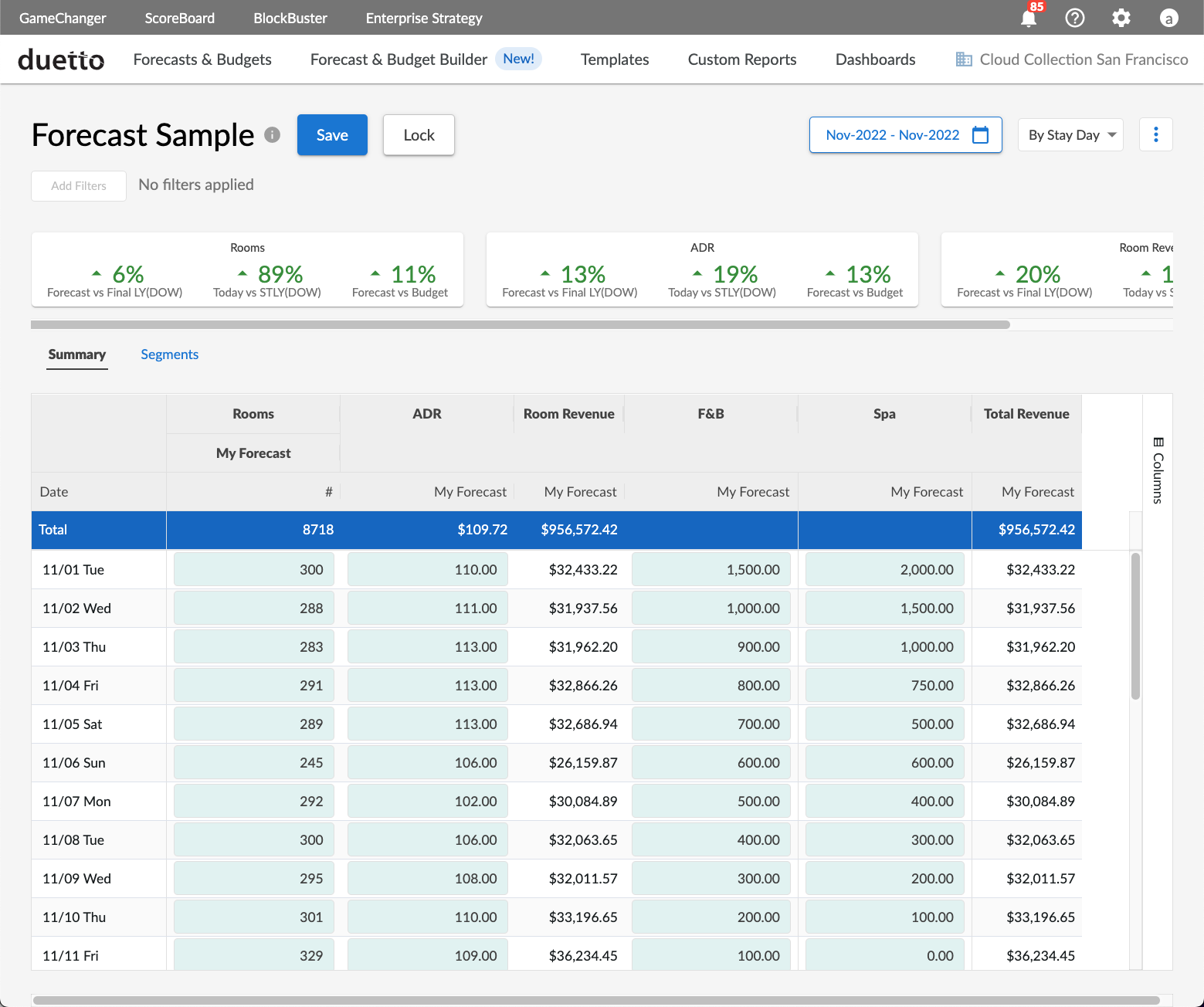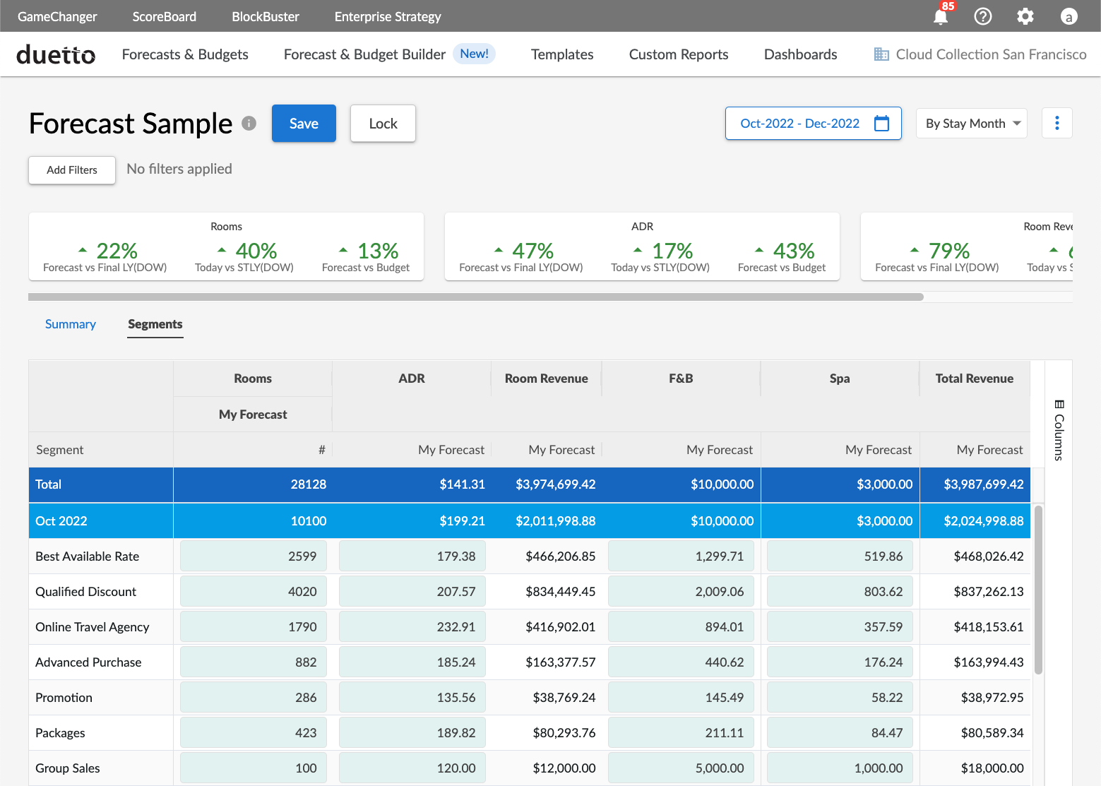 Duetto allows you to manage your forecast in ScoreBoard’s integrated Forecast & Budget Builder. This allows you to update your forecast independently from the system forecast while leveraging Duetto’s controlled automation to easily generate and schedule forecast comparison reports.