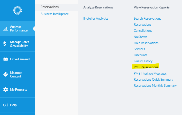 From the main menu: Analyze Performance > Reservations > View Reservation Reports > PMS Reservations