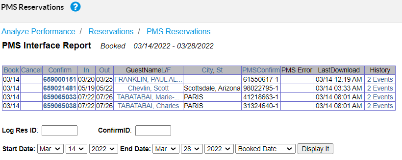 The PMS Interface Report will pop up in a separate window with the Reservation History & PMS Download Events